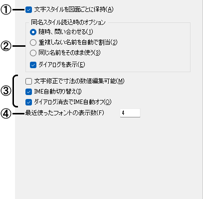 文字スタイルを図面ごとに保持する場合に☑します。それぞれの図面ごとに個別の文字スタイルリスト(最大31種類)が保存されます(詳細は【文字スタイル登録】コマンド参照)。