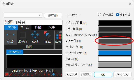 カスタム | : | 既存のライト・ダークをベースにリボンやパレット、ツールバーなどの色を変更できます。 |
