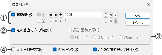 ③移動量を図面から指定する場合に、ドラッギング中に変形した図形の長さや面積を表示する場合に☑し、表示単位を指定します。
