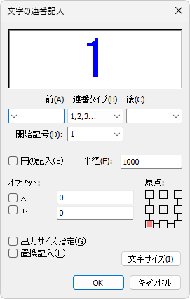 ⑧カーソルから作図する文字または円の原点を離して記入する場合に☑し、原点からの距離を入力します。