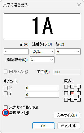 1.連番にするタイプを選択し、開始番号を指定します。プレビューに配置する文字が表示されます。[☑置換記入]にし、[OK]ボタンをクリックします。