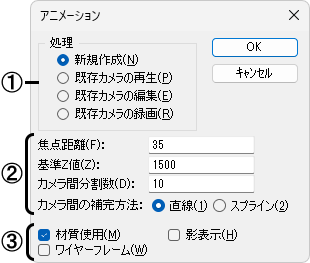 ワイヤーフレームでアニメーションを再生します。☐の場合は、隠面除去表示で再生されます。