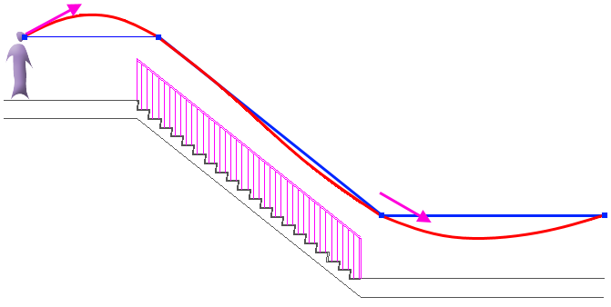 補完方法が「スプライン」の場合、カメラ間を滑らかに補完しますが、階段のように視線が下がる(または上がる)ような場面では「スプライン」で補完すると、視線が少し上がる(または下がる)ことがあります。このような場合には、「直線」で補完すると、より自然に表現できます。 |