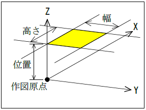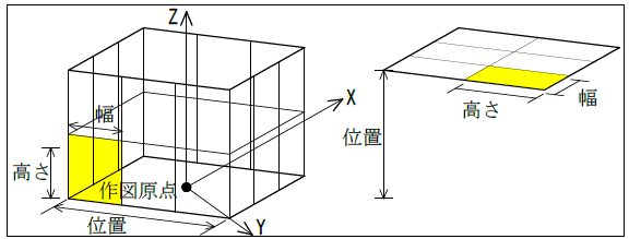 立方体側面の設定の場合、側面の長さ(X-Y)を設定します。原点を中心として、+方向-方向にそれぞれ位置分の長さを持ちます。(立方体の側面の長さは、位置で設定した値×2で正方形となります。)