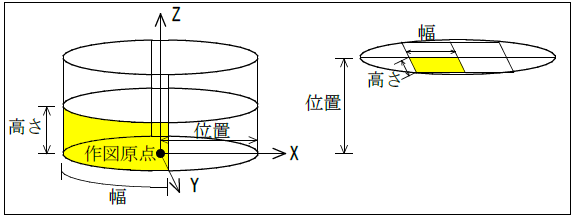 上部には円柱の半径、下部には円柱の高さを設定します。円柱のふたの設定の場合、原点位置からの高さ(Z)を設定します。