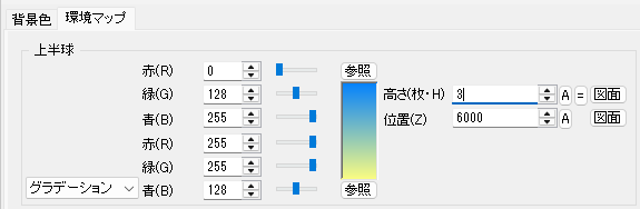 球]と同様に、緯度方向の分割数を指定します(例えば3と設定すれば90/3=30で原点から30度の位置で地上部分のカラーから空部分のカラーに変化します)。