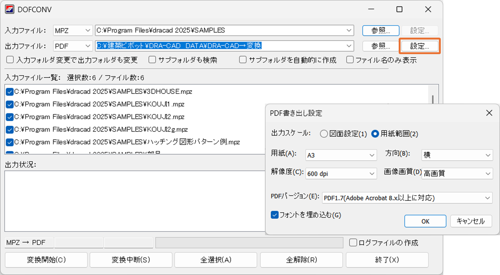 ※「設定」ボタンをクリックすると、出力ファイルのフォーマットに従って設定ダイアログが表示され、詳細な設定ができます。