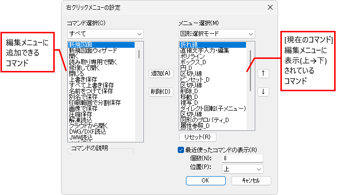 【右クリックメニューの設定】コマンドで右クリックメニューにコマンドを追加することや削除するなどのカスタマイズが行えます。