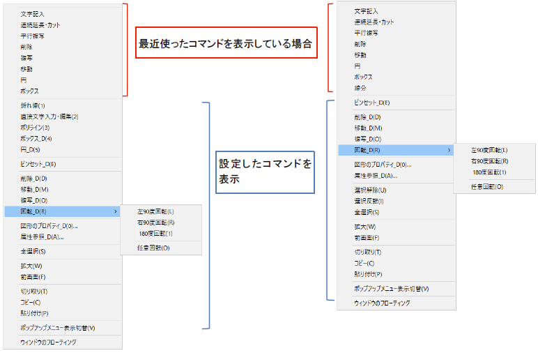 [最近使ったコマンドの表示]に☑を入れると、右クリックメニューの上か下に最近使ったコマンドを表示します。