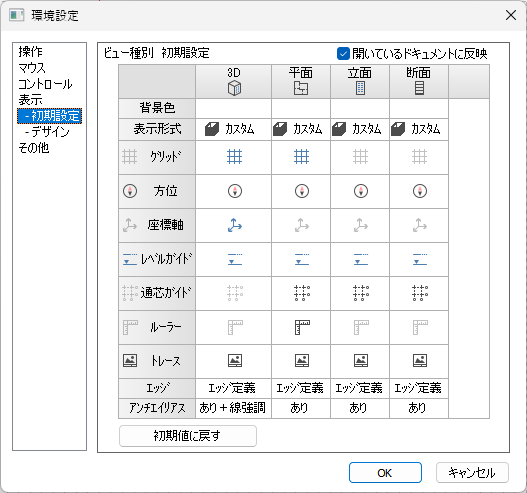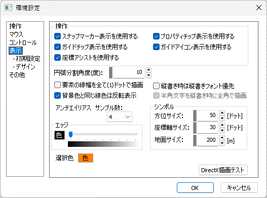 背景色、表示形式、グリッドや方位などのシンボル表示、エッジ、アンチエイリアスの設定ができます。