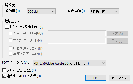 ここでは、作成するPDFファイルの解像度、セキュリティ、PDFのバージョン等を設定します。