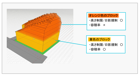 その結果をもとに、計画地にどれくらいの規模の建築物を立てられるか、あたりをつけるような検討が可能になります。