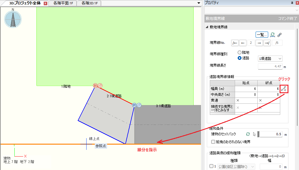 建物のセットバックの位置を画面で1点指示して建物のセットバックに値を設定します。