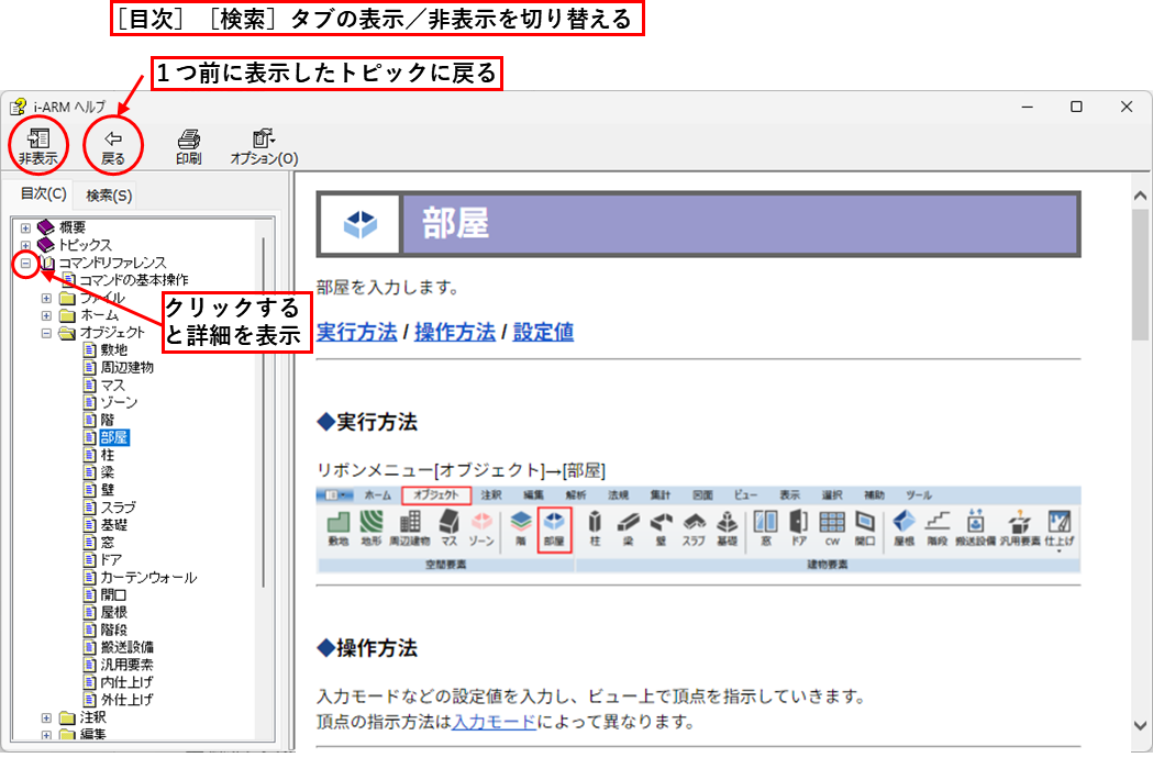 左側に表示される目次から参照したい項目をクリックすると、解説が表示されます。