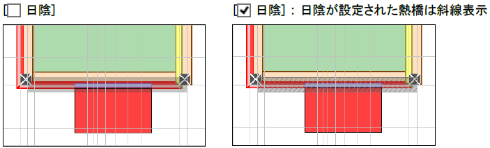 | 日陰 | 熱橋が生じる部位が「指定しない」(独立熱橋)の時に、有効となります。 1年中を通して日が当たらない場合に、 ✔ を入れます。日陰が設定された 熱橋は斜線表示されます。1)参照 |