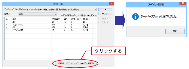 [初期値としてデータベースフォルダに保存]ボタンをクリックすると、現在の材料一覧がデータベースフォルダに保存され、 プロジェクトを新規作成する際の初期値として利用できます。