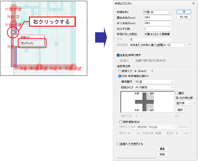 [プロパティ]を選択すると、熱橋のプロパティダイアログが表示されます。