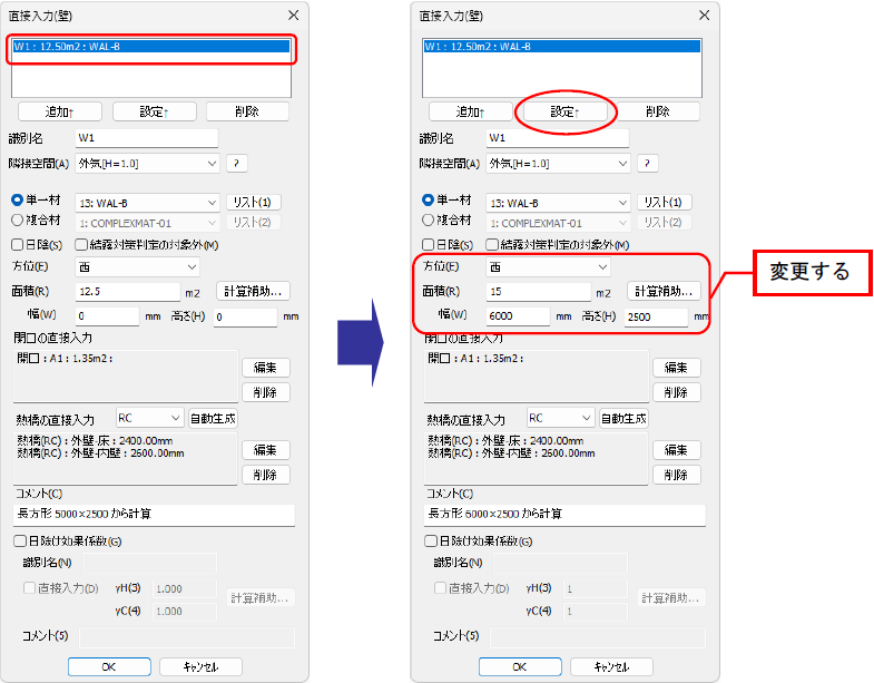 [OK]ボタンをクリックすると、直接入力(壁)のダイアログに戻り、「開口の直接入力」に変更した開口の内容が表示されます。[設定↑]ボタンをクリックすると書き換えられます。