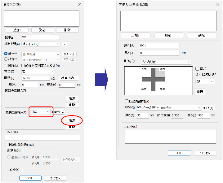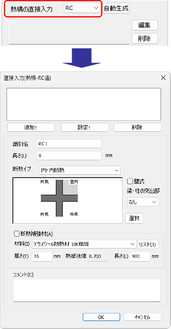 直接入力(熱橋-RC造)ダイアログが表示されます。