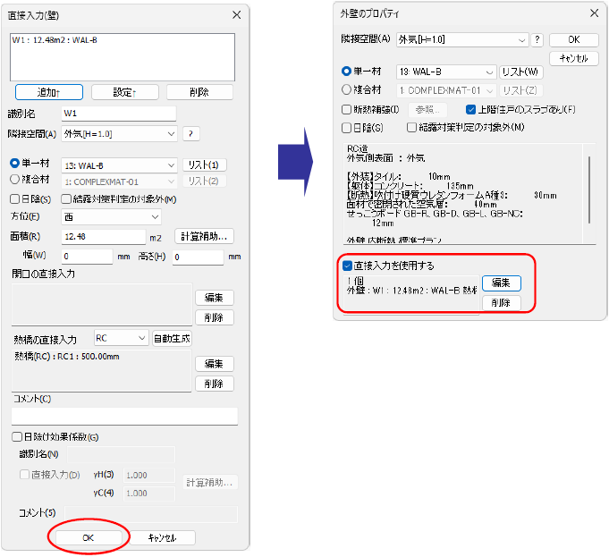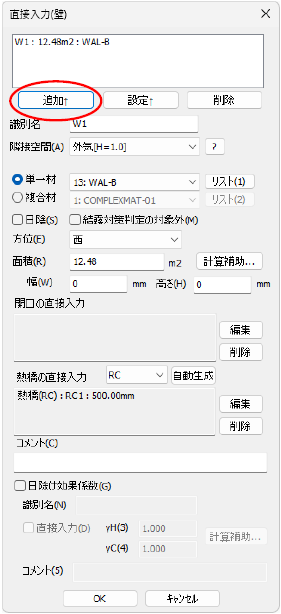 [OK]ボタンをクリックすると、直接入力(壁)ダイアログに戻り、「熱橋の直接入力」に設定されます。