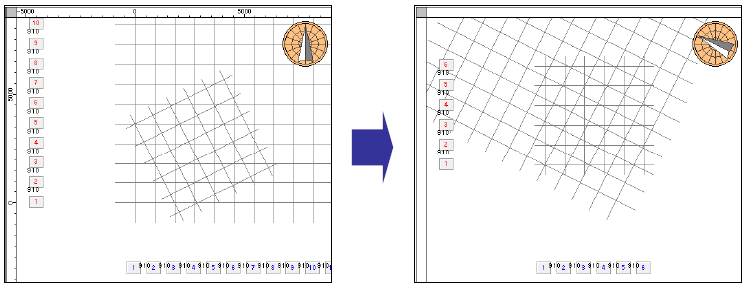 コマンドをクリックするごとに、通り芯ユニットの角度で回転した表示に、順に切り替わります。