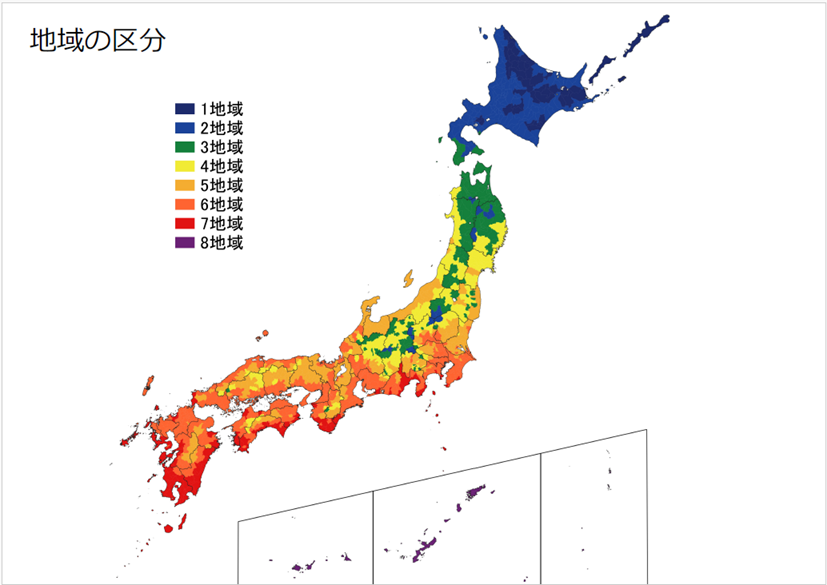 年間の日射地域区分は、全国をA1 区分からA5 区分の5 つに区分されます。