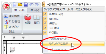 ボタンを選択すると、クイックアクセスツールバーのカスタマイズメニューが表示されます。