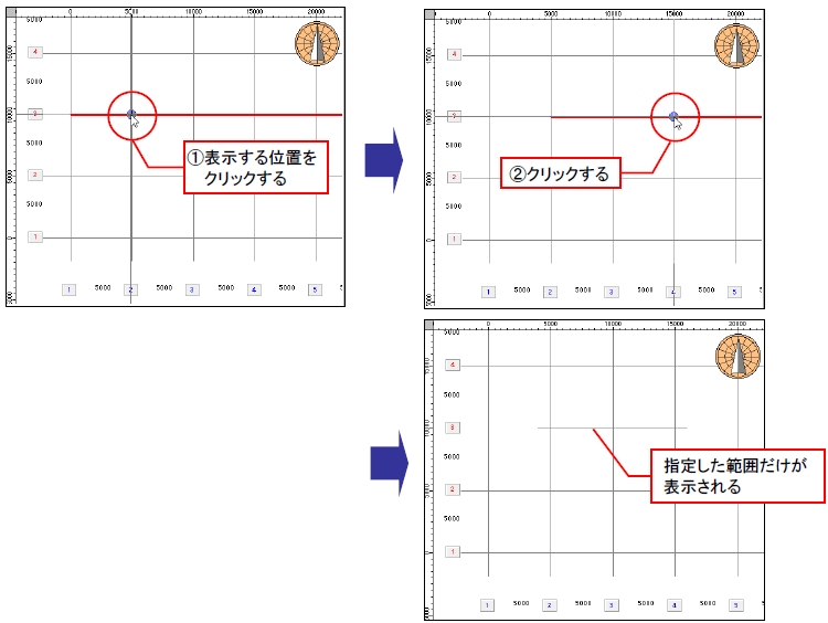 [表示範囲を変更]をクリックし、表示したい範囲の2点を指定すると、指定した範囲だけが表示され ます。元の表示に戻したい場合は、[表示範囲を変更]をクリックし、表示したい範囲の2点(軸の端 から端の点)を指定します。