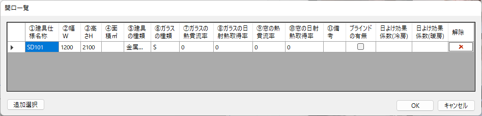 | ①建具仕様名称 | モデル開口要素のプロパティの「①建具仕様名称」を表示・設定します。 外皮に関連付いていない開口は、赤色の背景で表示されます。 |