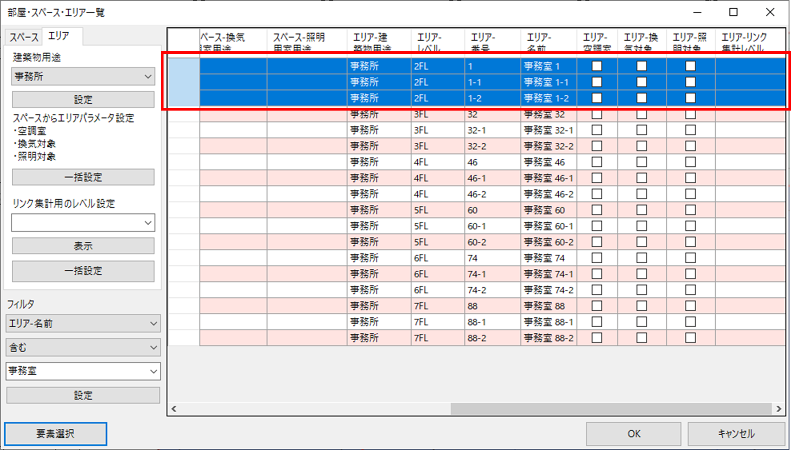 ・[一括設定]ボタンで「エリア-空調室」列、 「エリア-換気対象」列、「エリア-照明対象」 列に設定されます。 |