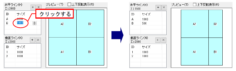 | 水平ライン | 水平方向の材料のサイズを入力します。1)参照 |