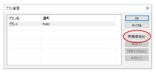 - [新規追加]ボタン :新規にプランを作成し追加します。プラン概要ダイアログが表示されます。