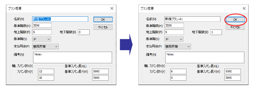 プラン名や基準階高、階数、基準スパン長など必要な項目を変更し、[OK]ボタンをクリックします。