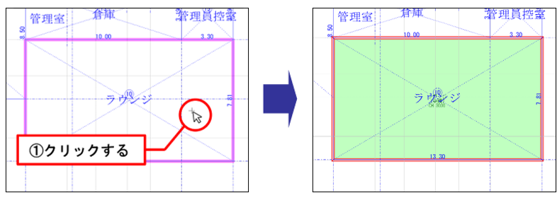 グリッドに沿って対角にクリックすると、部屋が入力されます。