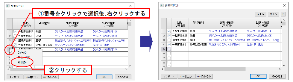 削除する番号をクリックし、右クリックで表示されるメニューから、[削除]をクリックすると、削除されます。