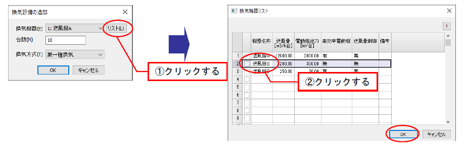 ※換気機器をプルダウンリストから選択、または[リスト]ボタンから選択します。