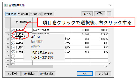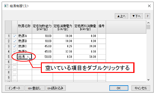 3)リストのインポートダイアログで、[OK]ボタンをクリックすると、給湯機器リストダイアログに読 込まれます。給湯機器リストダイアログで、[OK]ボタンをクリックすると設定されます。