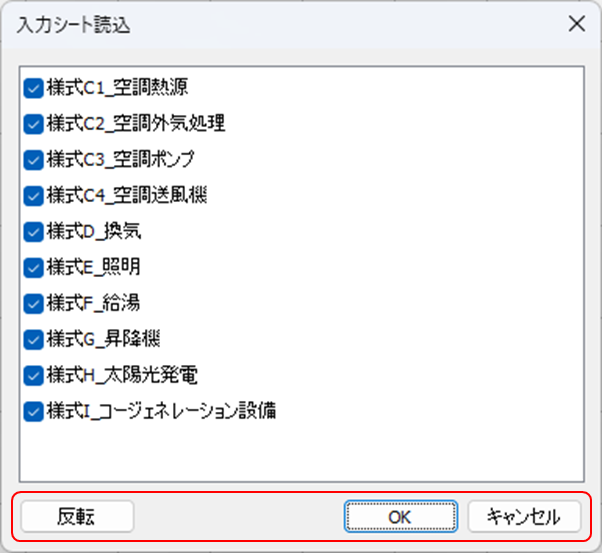 読込んだリストは、【空調機器リスト】、【換気機器リスト】、【照明機器リスト】、【給湯機器リスト】、【昇降機リスト】、【太陽光発電リスト】、【コージェネ レーション設備リスト】コマンドで確認できます。