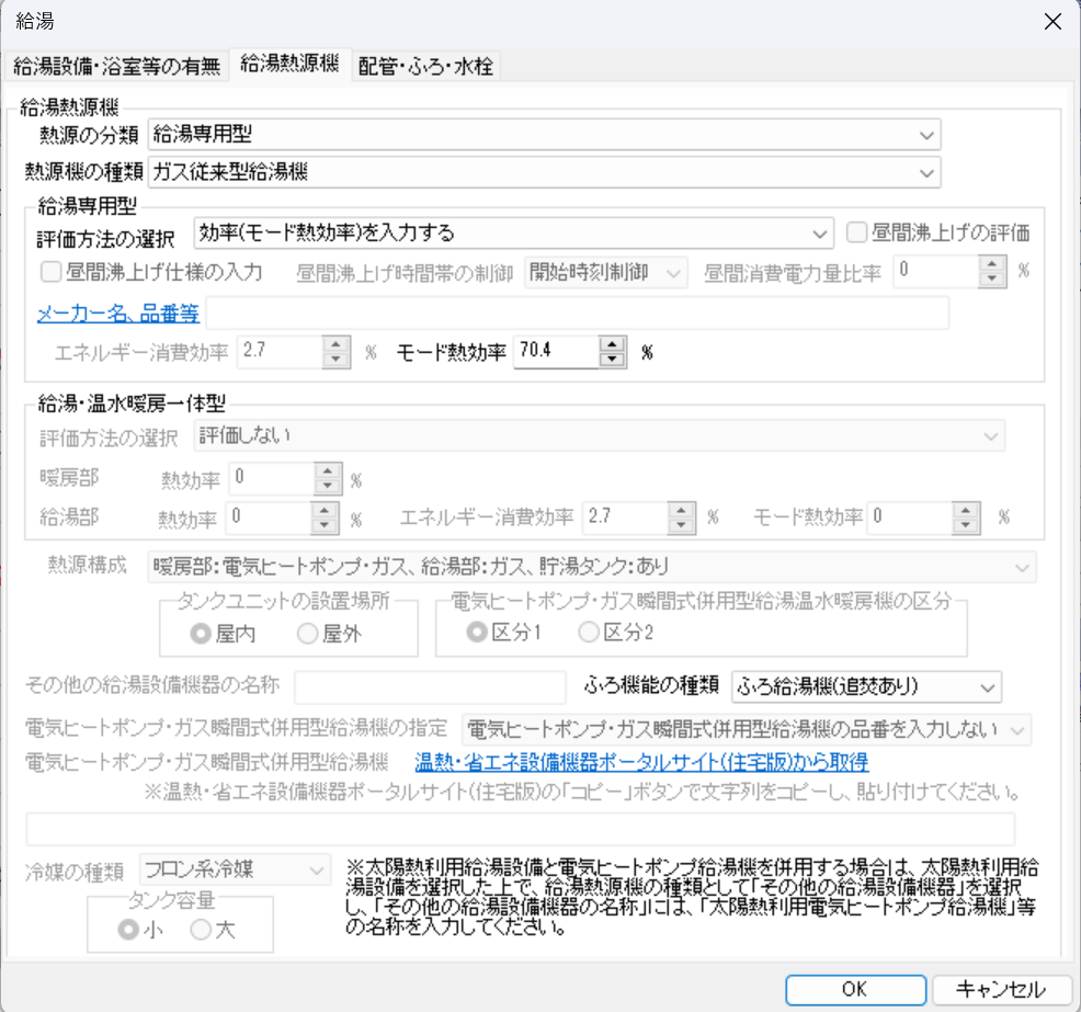 | 給湯接続方式の種類 | 設備の種類が「密閉形太陽熱温水器(直圧式)」、又は「ソーラーシステム」の場合、 給湯接続方式の種類を選択します(※1)。 |