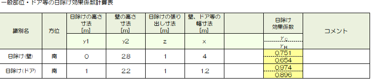壁の直接入力で日除け効果係数を設定した場合、「一般部位・ドア等の日除け効果係数計算表」が出力されます。