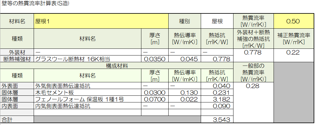 外装材と断熱補強込みの熱橋部の補正熱貫流率が表示されます。 | ||
