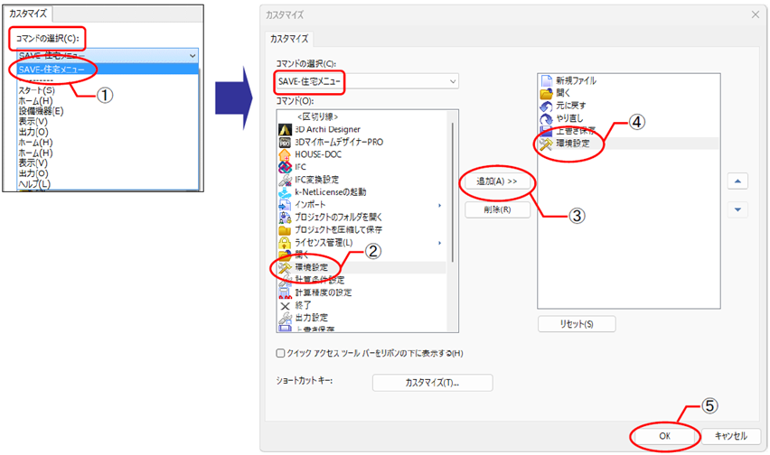 ①追加するコマンドのメニュー名を[コマンドの選択]のプルダウンリストから選択します。