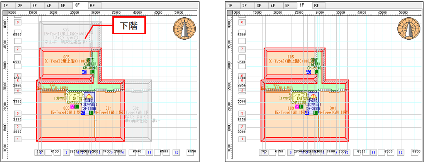 下階]をクリックすると、現在入力している階の下階のプランを非表示にします。再度、クリックすると表示します。