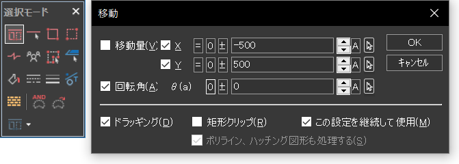 DRA-CAD22シリーズより「環境設定」コマンドでダイアログの「上」「下」「左」「右」の指定した位置に、選択モードバーを表示する設定を追加しました。